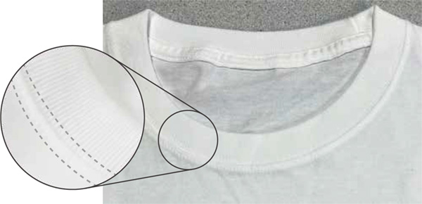 Tシャツ内側の肩端から肩端にかけて衿伏せテープを縫い付ける事により、伸びや型崩れを軽減します。(タコバインダー始末)また縫い代が肌に当たらず、着心地も良くします。