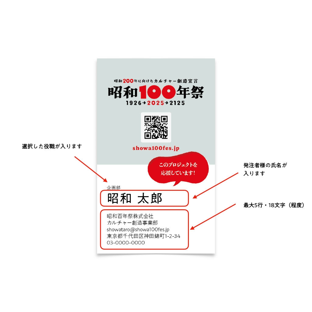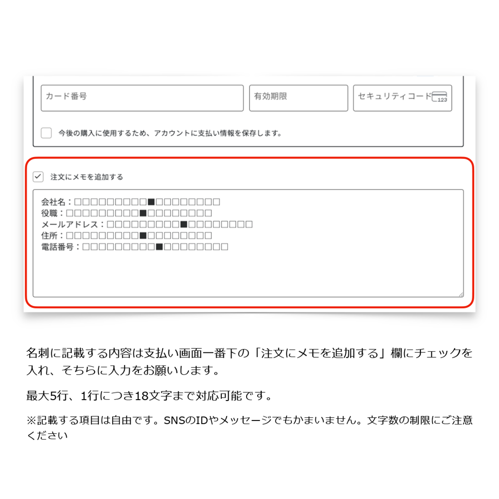 名刺に記載する内容は支払い画面一番下の「注文にメモを追加する」欄にチェックを入れ、そちらに入力をお願いします。